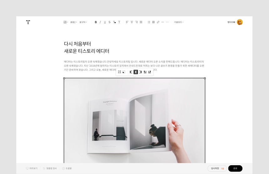 새 에디터가 오히려 조금 불편하셨나요? 불편을 드려 죄송합니다. 겸허히 귀 기울이고 열심히 개선해 나가겠습니다.