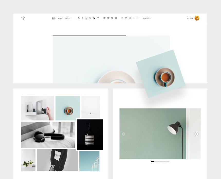이제 플래시 없이 이미지와 파일을 올릴 수 있습니다. 마우스 드래그나 붙여 넣기를 이용한 삽입도 가능합니다. 크기 조정과 크롭, 간단한 이미지 편집도 지원합니다. 이미지를 드래그하여 그룹 이미지를 만들 수 도 있습니다. 슬라이드 기능도 쓰기 좋게 개선했습니다. (※ 그룹 이미지 만들기 등 일부 기능은 IE 브라우저에서는 작동하지 않습니다.)