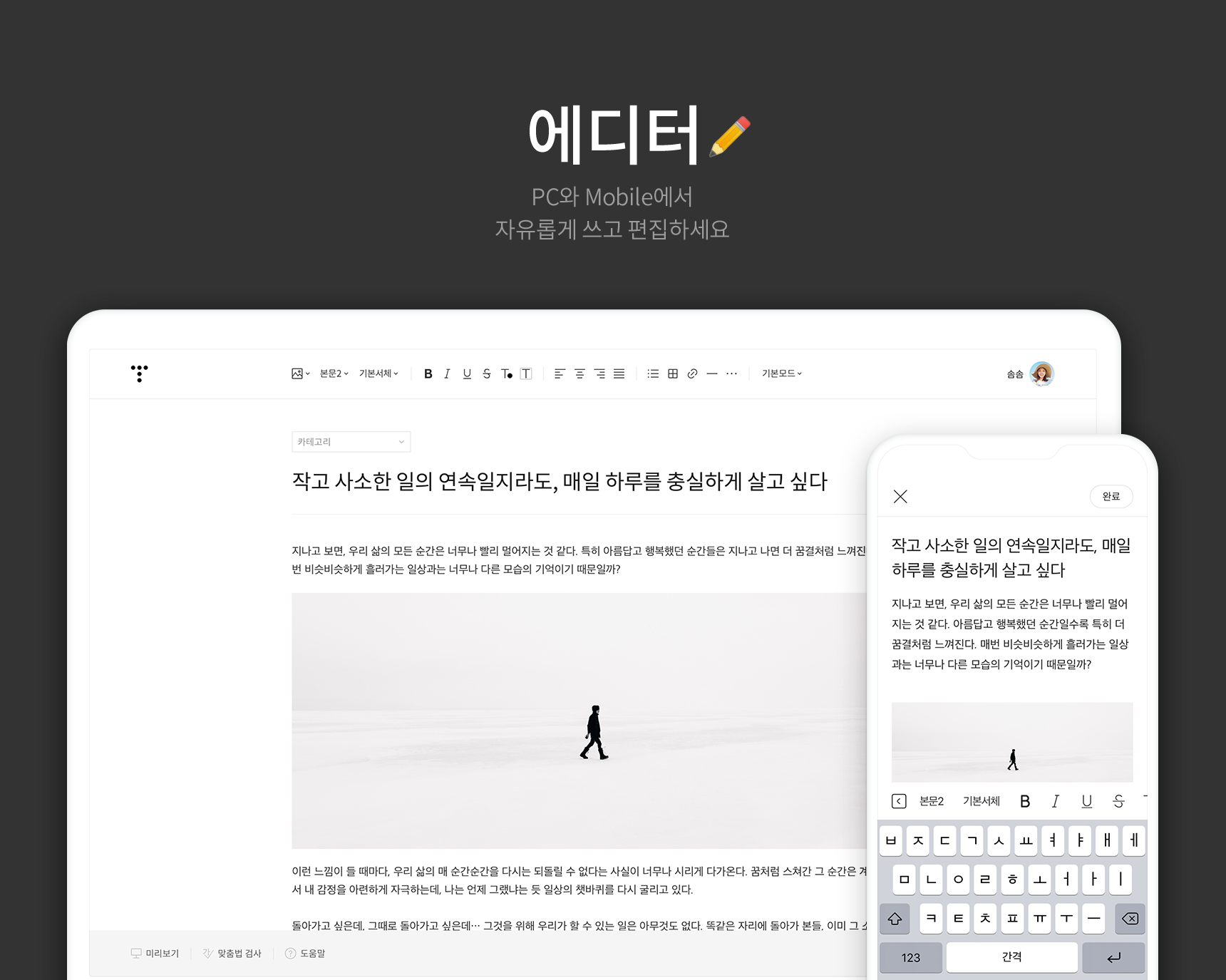 PC 웹에서 작성한 글도 이제는 모바일앱에서 수정해보세요. 새 글 역시 모바일에서 간편하게 작성할 수 있습니다.