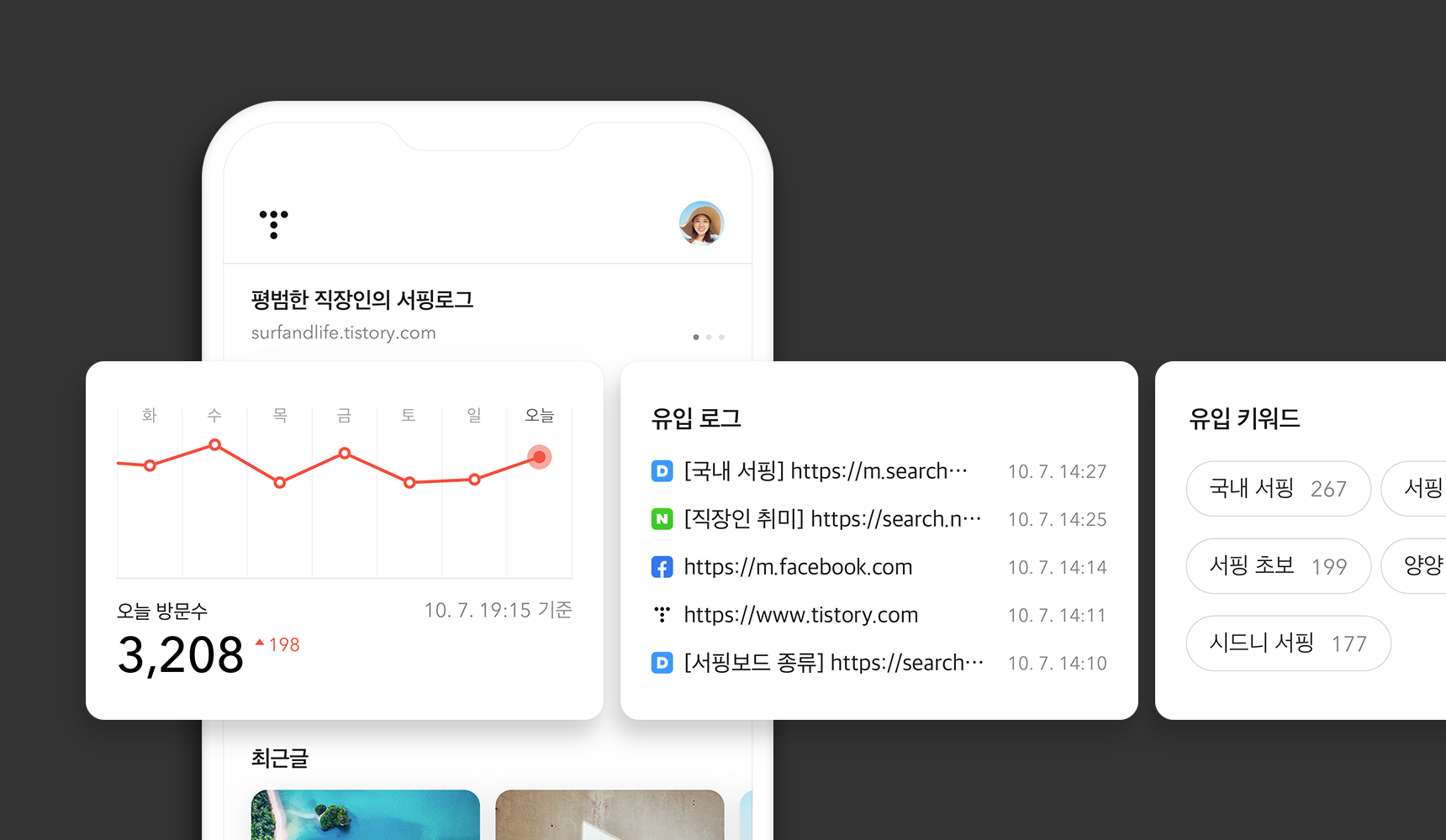 카드를 한 번 더 왼쪽으로 밀면 최근 7일 간의 유입 키워드 목록이 나타납니다. 검색 엔진에서 어떤 키워드를 통해 여러분의 블로그로 유입되는지 확인해보세요.