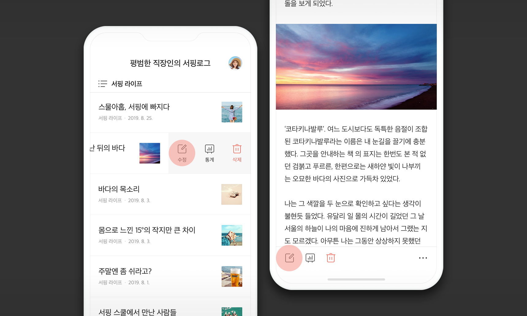 글 제목이나 내용을 수정하는 것도 간편합니다. 내 블로그 탑의 글 목록에서 원하는 글을 선택, 오른쪽에서 왼쪽으로 살짝 밀어보세요. 글 수정 및 통계 보기, 삭제가 즉시 가능합니다. 혹은 현재 보고 있는 내 블로그 글의 하단 더보기 메뉴를 통해 에디터에 진입할 수 있습니다.