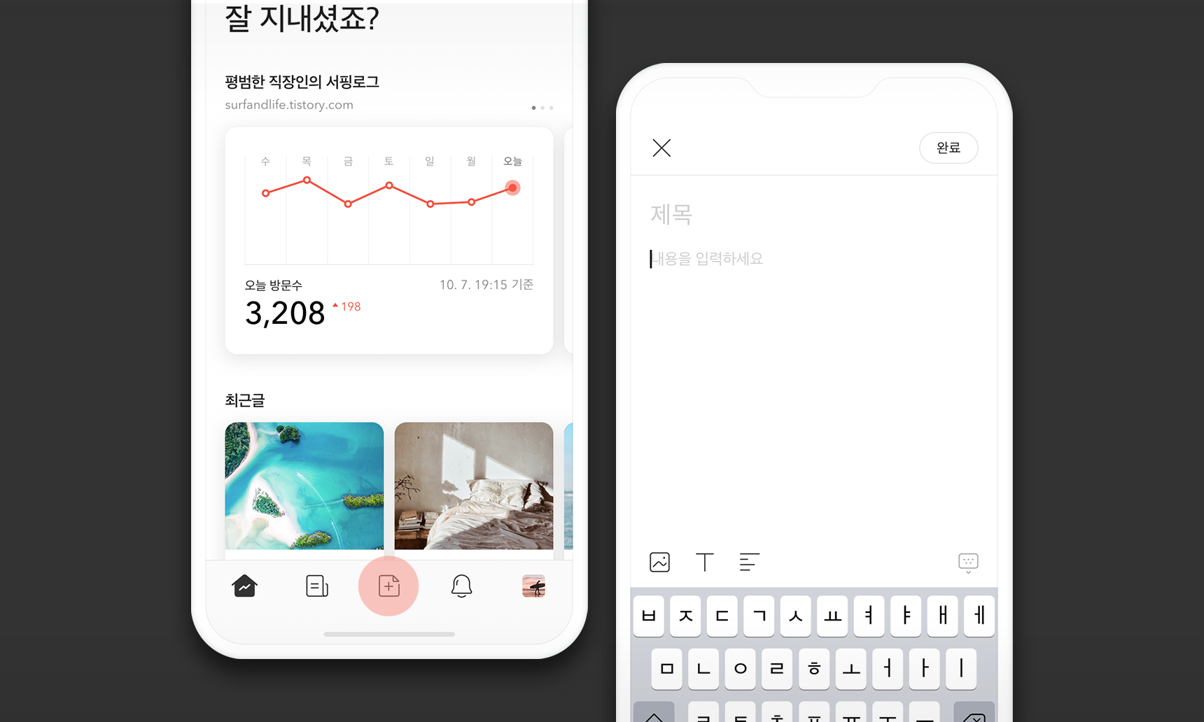 언제 어디서나 새 글을 작성해보세요. 하단 탭에 위치한 에디터 버튼을 누르면 새 글 작성이 시작됩니다.