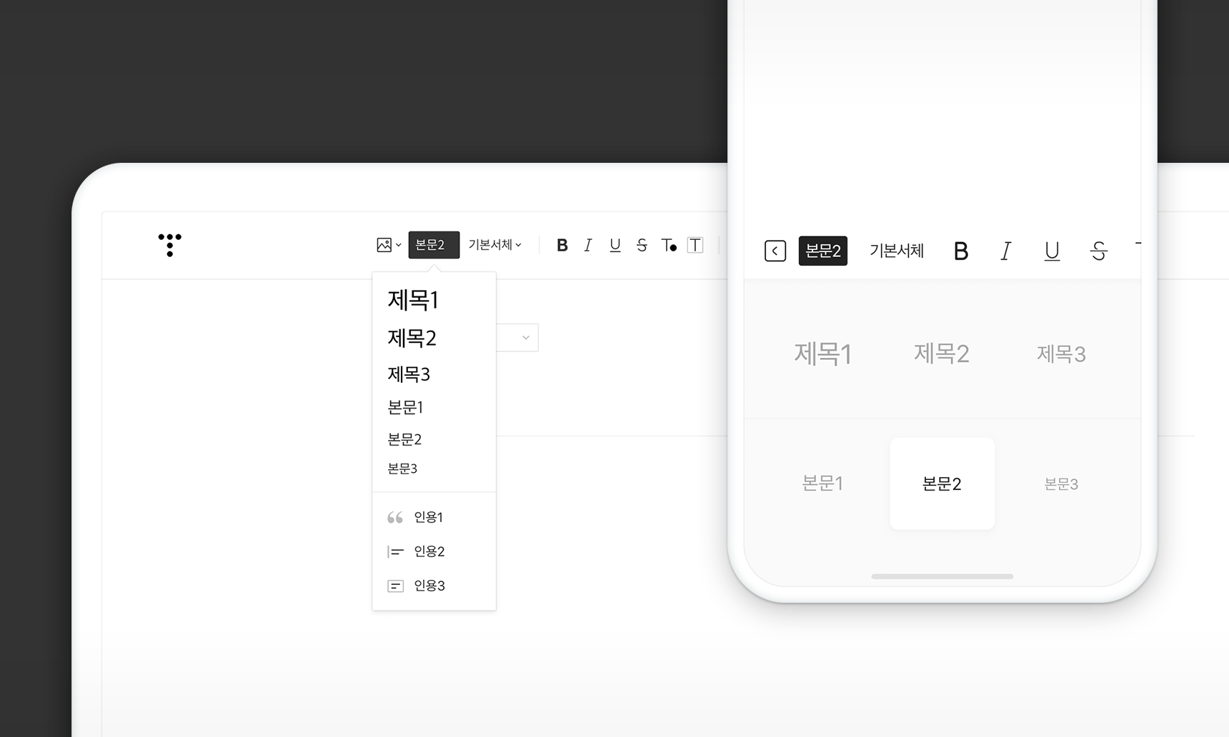 PC에디터에도 변경이 있습니다. 본문 스타일의 제공 범위가 모바일 앱 에디터에 따라 '3개'로 조정되었습니다.