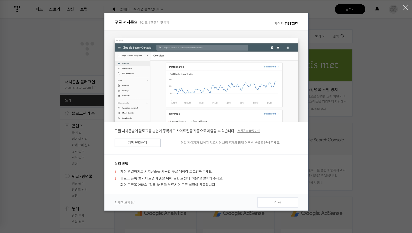 '허용' 버튼 클릭 후, 플러그인 설정 레이어에서 'Search Console에 블로그가 등록되었습니다.'라는 문구를 확인해주세요. 해당 문구가 아래 화면과 같이 정상적으로 나타났다면, '적용' 버튼을 클릭하여 등록 절차를 마무리할 수 있습니다.