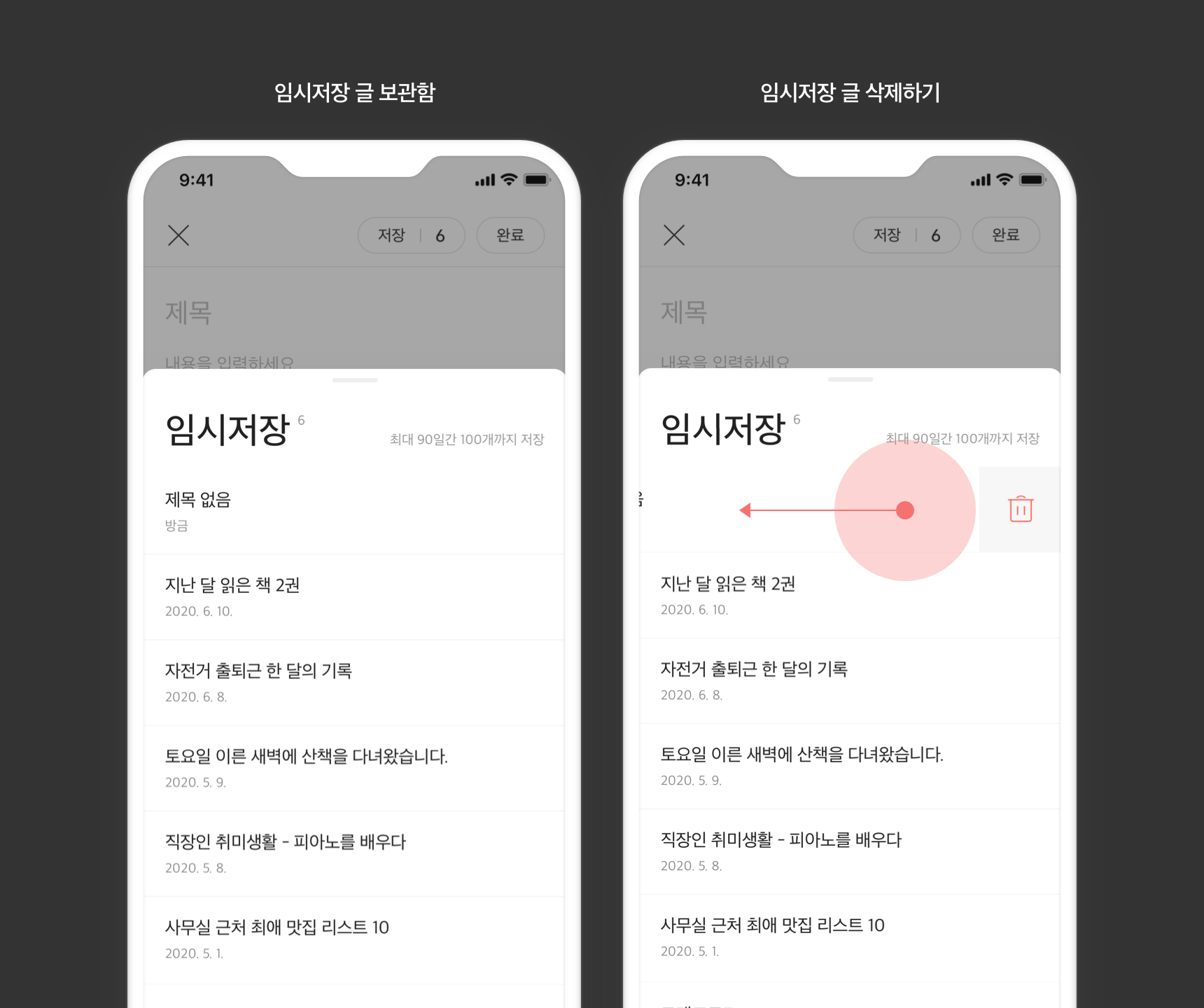 삭제하기 원하는 임시저장 글을 왼쪽으로 밀어 넘기면 삭제 버튼이 나타납니다. 앱에서 임시저장 글을 삭제하면 서버에서 삭제되어 PC에서도 확인할 수 없게 됩니다.