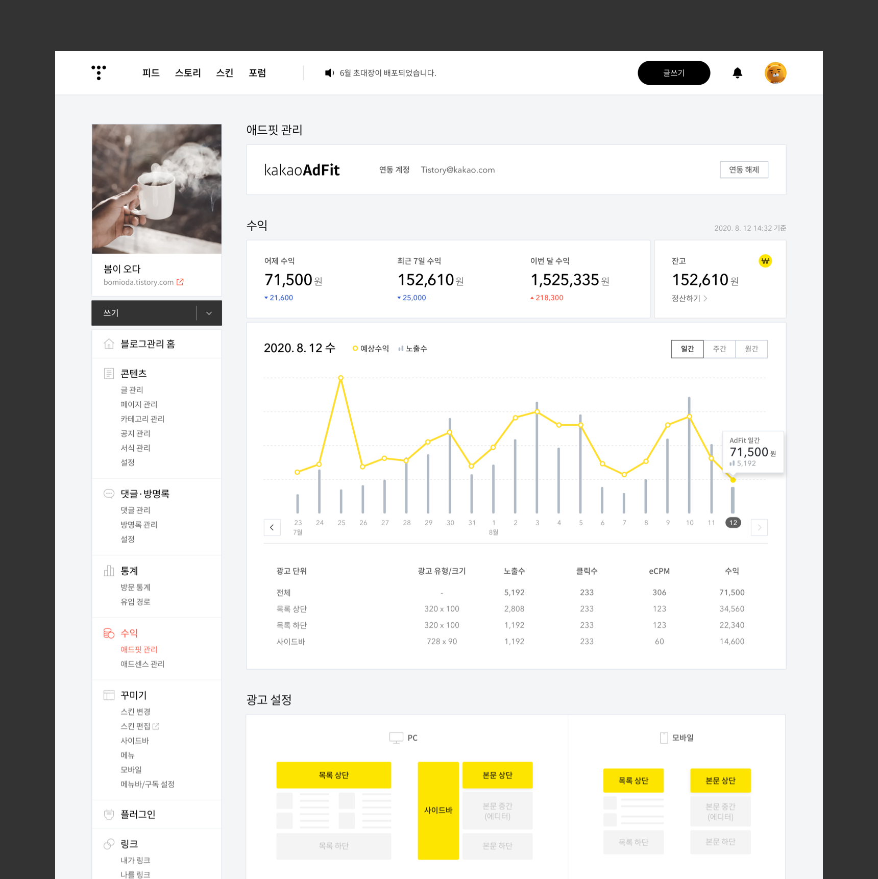 카카오 애드핏과 구글 애드센스 등 광고 플랫폼을 쉽게 적용하고 관리할 수 있는 신규 기능을 준비 중입니다. 보다 쉬운 애드센스 연동 및 ads.txt 문제 해결을 위하여 구글 측과 협업도 함께 진행하고 있습니다. 보다 다양한 내외부 광고 및 수익모델의 연동도 계속 확대해 나갈 예정이며, 수익 분석과 통계 기능도 새롭게 준비하고 있습니다. 새로운 수익 창출 강화 기능은 2020년 하반기에 선보일 예정이며, 추후 별도 공지로 상세히 안내드리겠습니다.