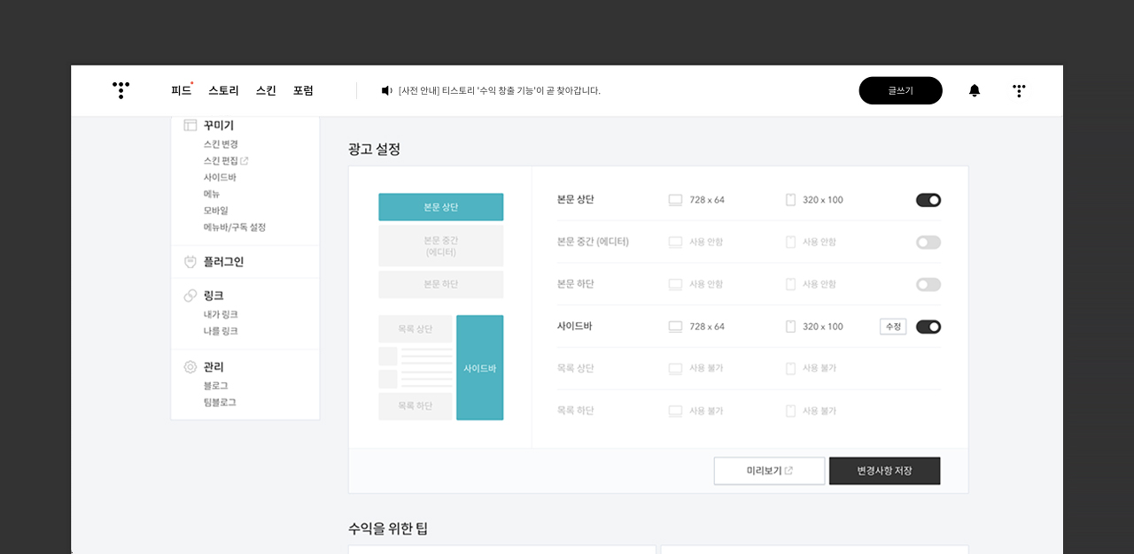 - 본문 중간(에디터) 광고는 편의성을 높이기 위해 1개만 설정 가능하도록 했습니다. 이후 개수를 점차 확대하는 방안도 고려 중이니 참고해 주세요.