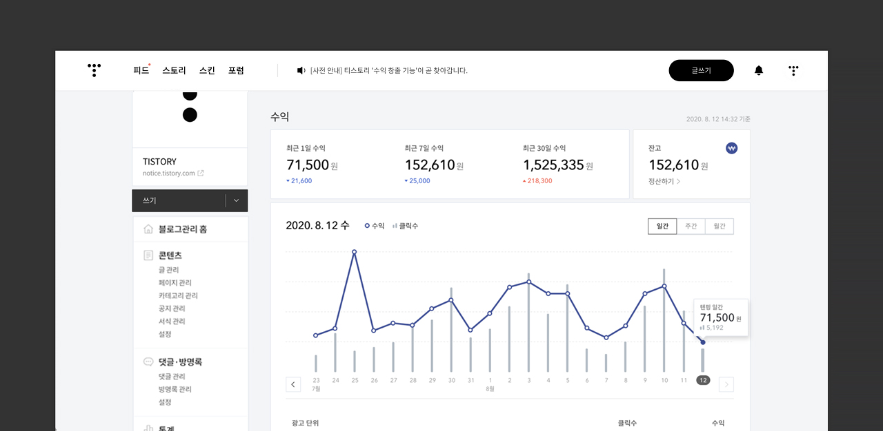 티스토리에서는 일/주/월 별 수익 추이 및 주요 통계 정보를 제공해 효율적인 광고 설정을 할 수 있도록 돕습니다.
