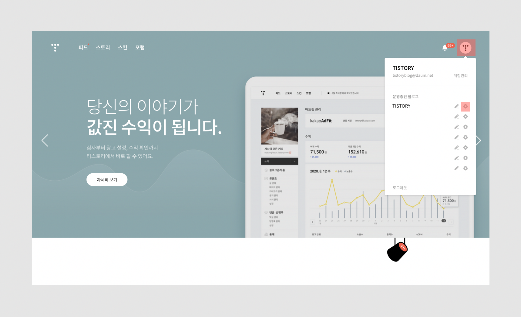 블로그 관리는 '티스토리 홈(tistory.com)'에 우측 상단 프로필에서 톱니바퀴 아이콘을 누르면 돼요.