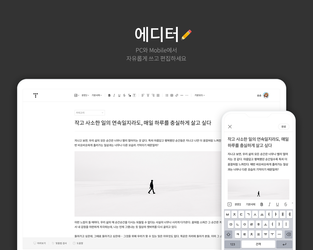 티스토리에서는 '티스토리 홈'(tistory.com)과 '블로그 관리'에서 글을 쓸 수 있어요.