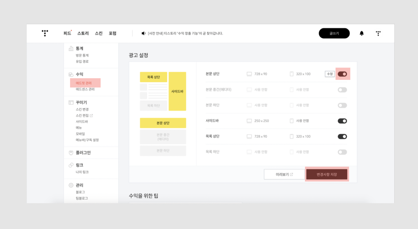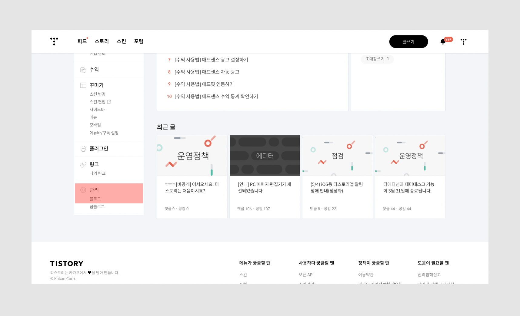 티스토리에서는 내 블로그에 광고를 붙이고 수익도 올릴 수 있어요. 블로그 관리 페이지에서 광고를 연동할 수 있죠.