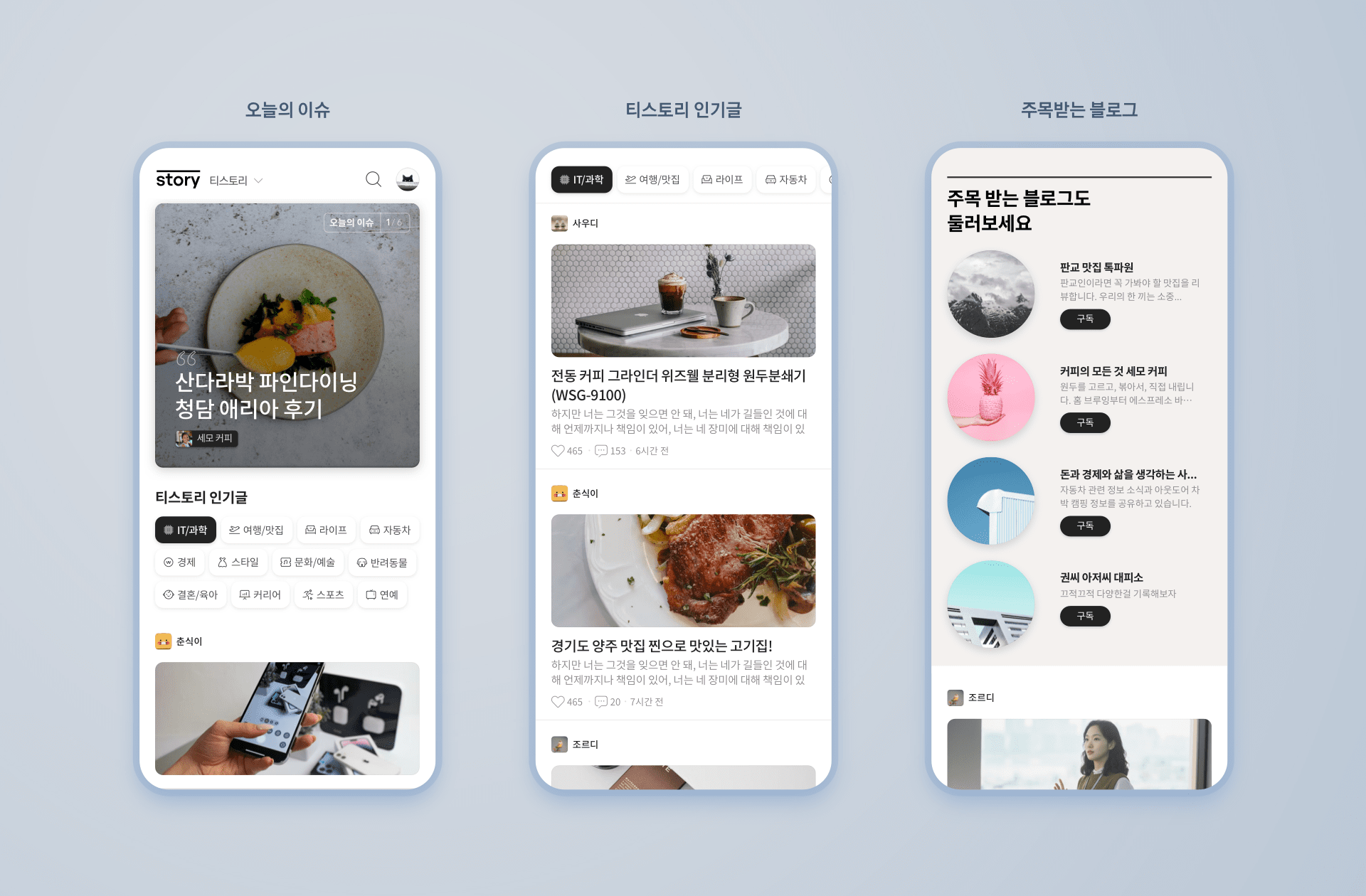 Story로 모이며 모바일 홈도 새 단장을 했습니다. 양질의 콘텐츠가 더 많은 유저와 만날 수 있도록, 대표 콘텐츠를 선별해 보여주고 콘텐츠 탐색 편의성도 높였어요. 카테고리가 세분화되어 원하는 분야의 글을 더 쉽게 찾아볼 수 있도록 했죠. 기꺼이 자신의 시간을 내 정보를 나누는 블로그들이 더 많은 사용자와 만날 수 있도록 콘텐츠를 담는 공간인 티스토리도 잘 가꾸어 가겠습니다.