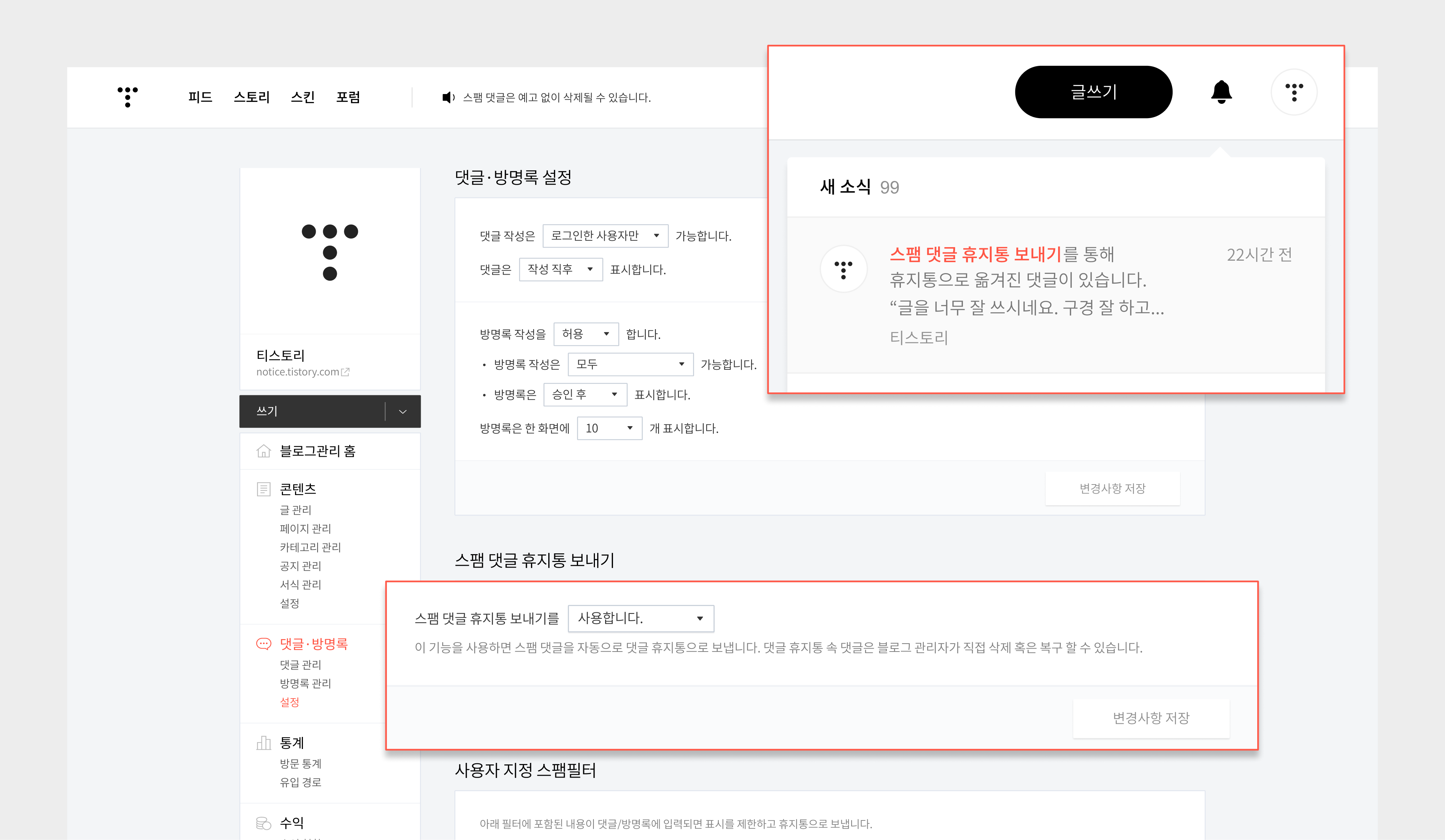 티스토리는 ‘스팸 댓글 휴지통 보내기’ 기능을 고도화하는 등 더욱 건강한 블로그 환경을 구축하기 위해 노력하겠습니다.