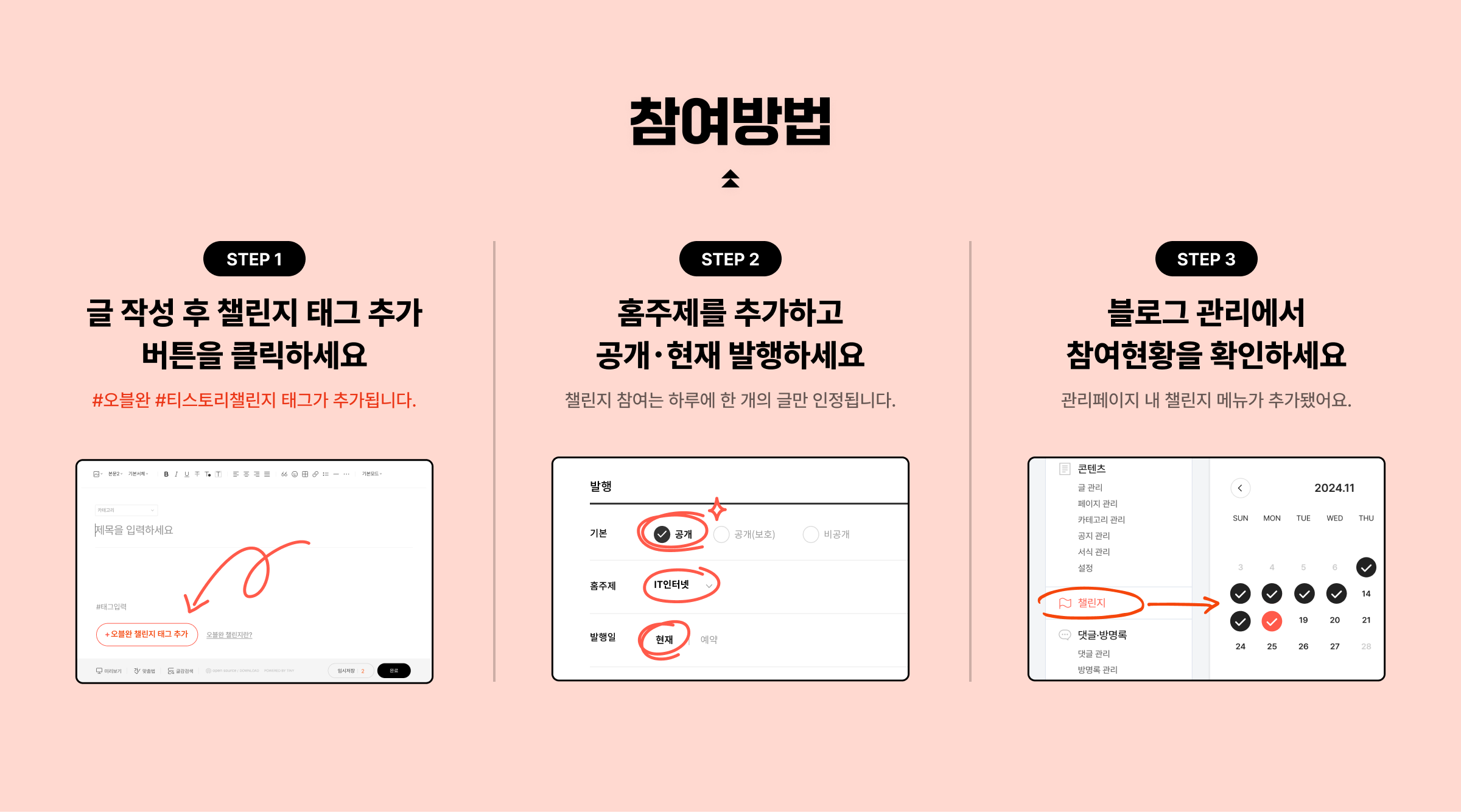 지금부터 ✏️ 참여방법과 챌린지를 성공적으로 완주할 수 있는 오블완 TIP✨을 소개해 드릴게요.