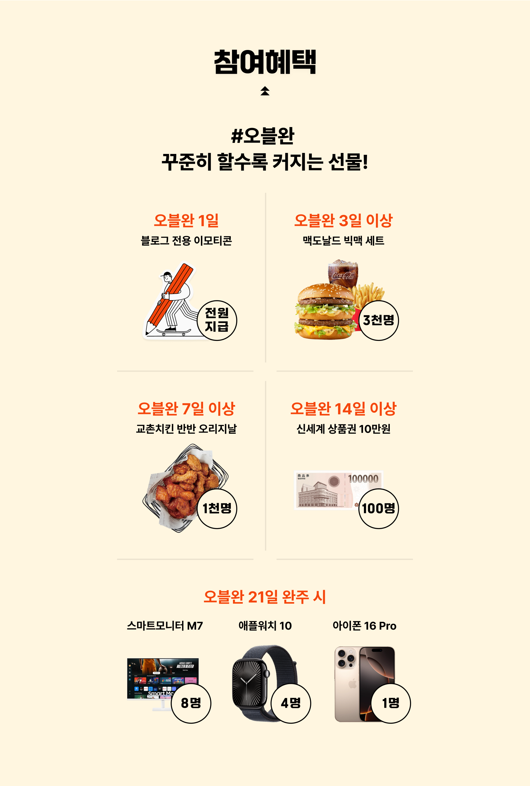 21일 모두 오블완 성공하면 📱 아이폰 16 Pro ⌚ 애플워치 🖥️ 스마트모니터가 기다리고 있어요.